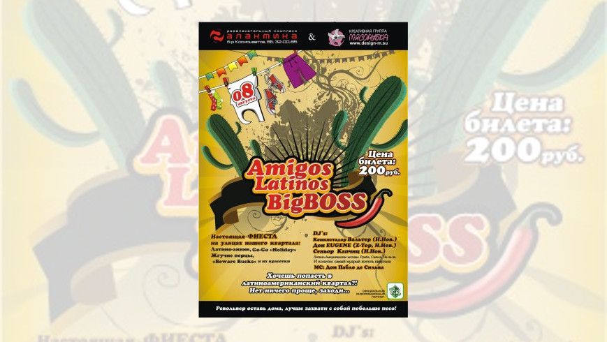 Действие: Жители квартала встречают гостей на входе, на сцене театрализованное вокально-танцевальное шоу, Go-Go «Holyday» (Н.Нов) и брейк бойз, Beware Bucks и их красотки, а так же конкурс для определения лучшего Биг босса вечера и его сеньориты. Победители получают ценный приз и бутылку текилы !!!