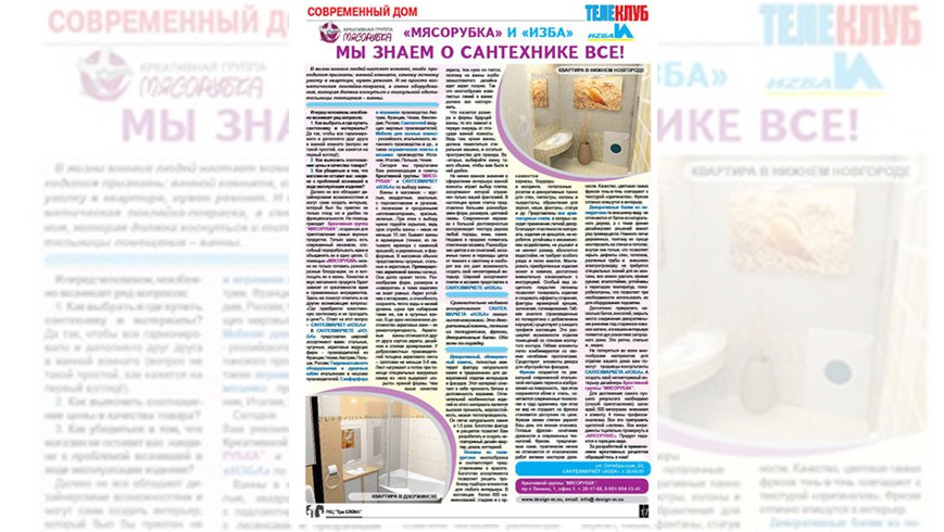 Далеко не все обладают дизайнерскими возможностями и могут сами создать интерьер, который будет приятен не только глазу, но и удобен по функциональности. На помощь приходит креативная группа «Мясорубка», созданная для приготовления самых вкусных продуктов. Только здесь есть современный механизм, способный переработать идеи и объединить их в одно целое. С помощью «Мясорубки» можно не только готовить разнообразные блюда-идеи, но и воплощать их в жизнь. Качество и вкус желаемого продукта будет зависеть от креативности идеи и применяемых ингредиентов. Здесь же помогут ответить и на другие возникающие вопросы: «Где приобрести качественную сантехнику и не прогадать в цене?». Ответ на этот вопрос – сантехмаркет «Изба»! В сантехмаркете «Изба» представлен широкий ассортимент ванн: стальные, чугунные, акриловые ведущих фирм-производителей из Франции, Чехии, Австрии, Польши, России; гидромассажного оборудования и душевых кабин итальянских и чешских производителей; санфарфора и керамики производства Австрии, Франции, Чехии, Финляндии, России; смесителей ведущих мировых производителей; мебели для ванных комнат – российского, итальянского, испанского производства и др., а также керамическая плитка и мозаика: производства Италии, Испании, Польши, Чехии.