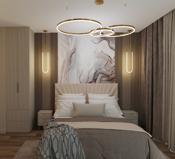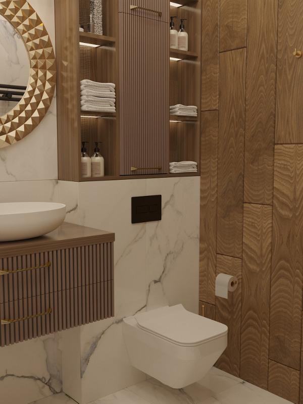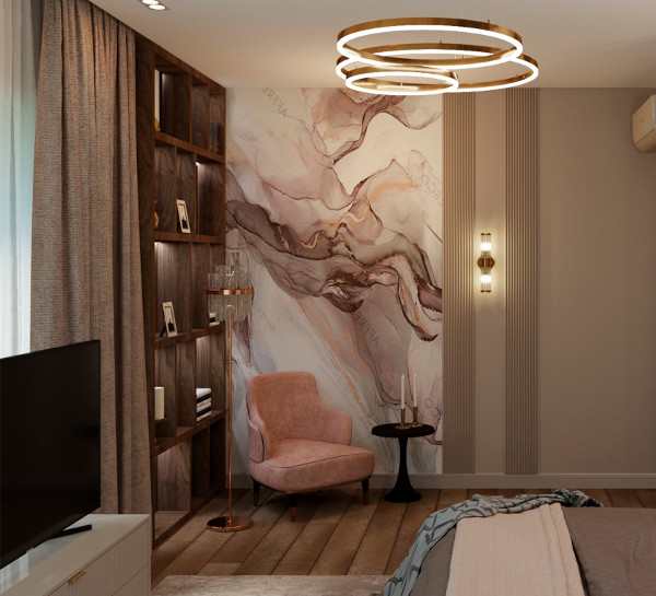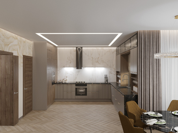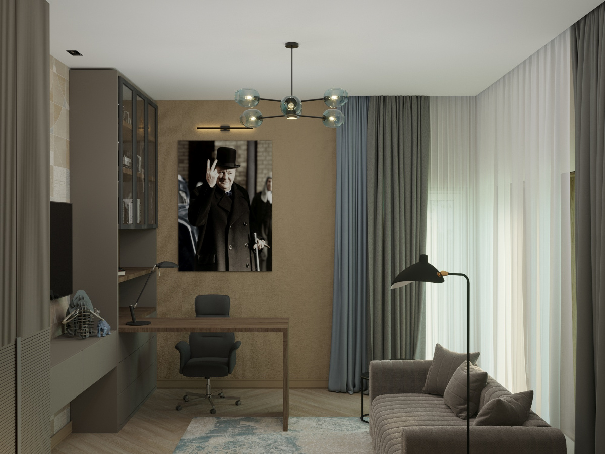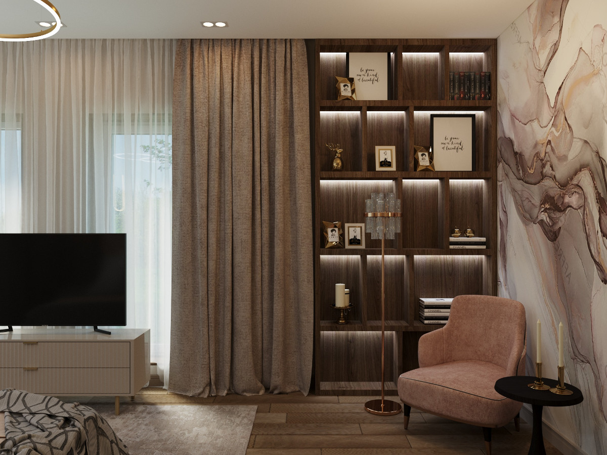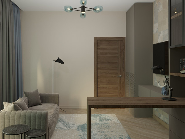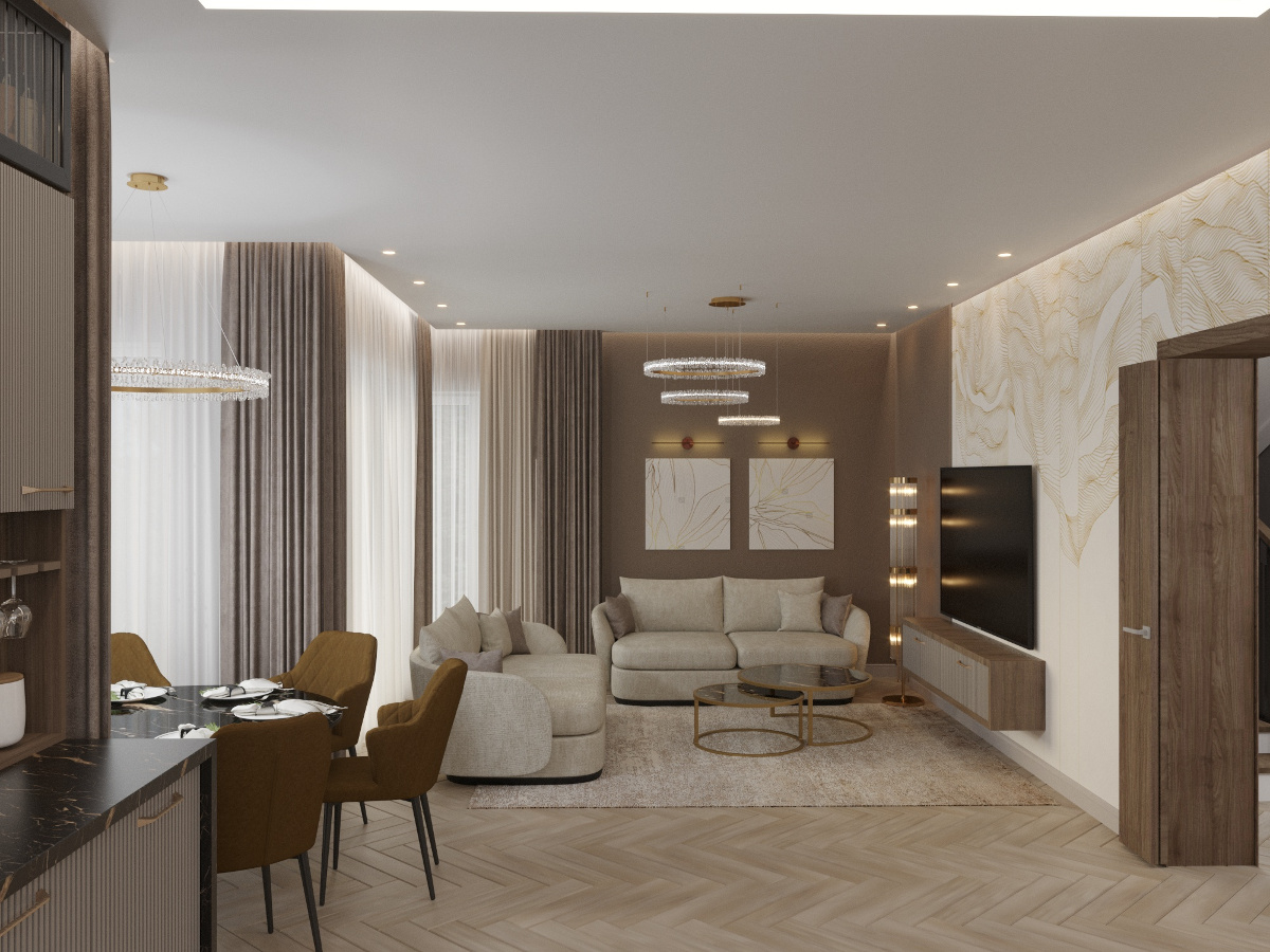 Настроение созданного интерьера повторяет атмосферу окружающей природы. Тёплые глубокие оттенки серого и кофейного, простые формы, геометрические линии сочетаются с фактурами дерева и благородного мрамора. Всё это разбавлено уютным текстилем и художественным декором.