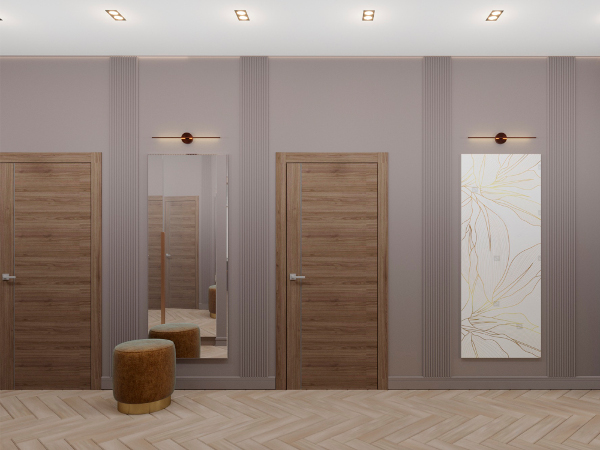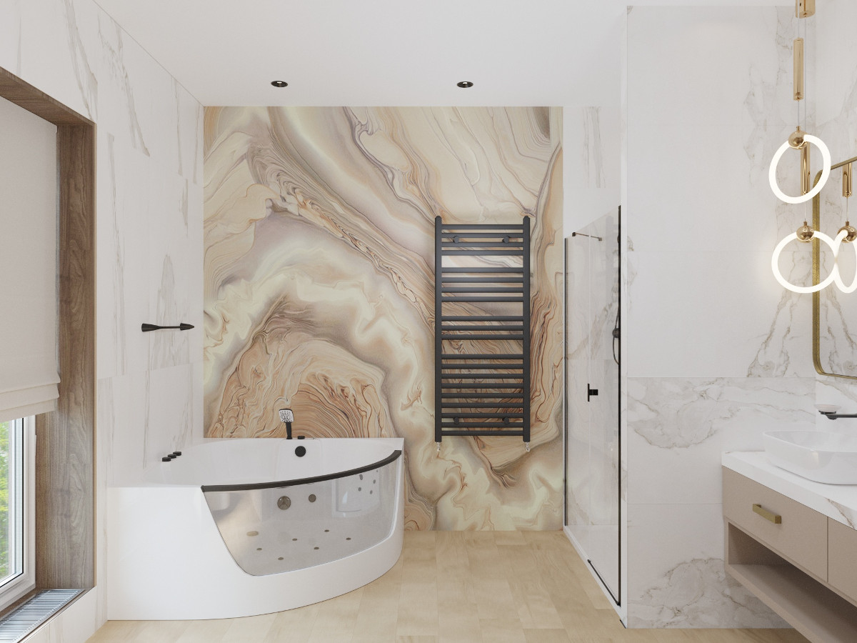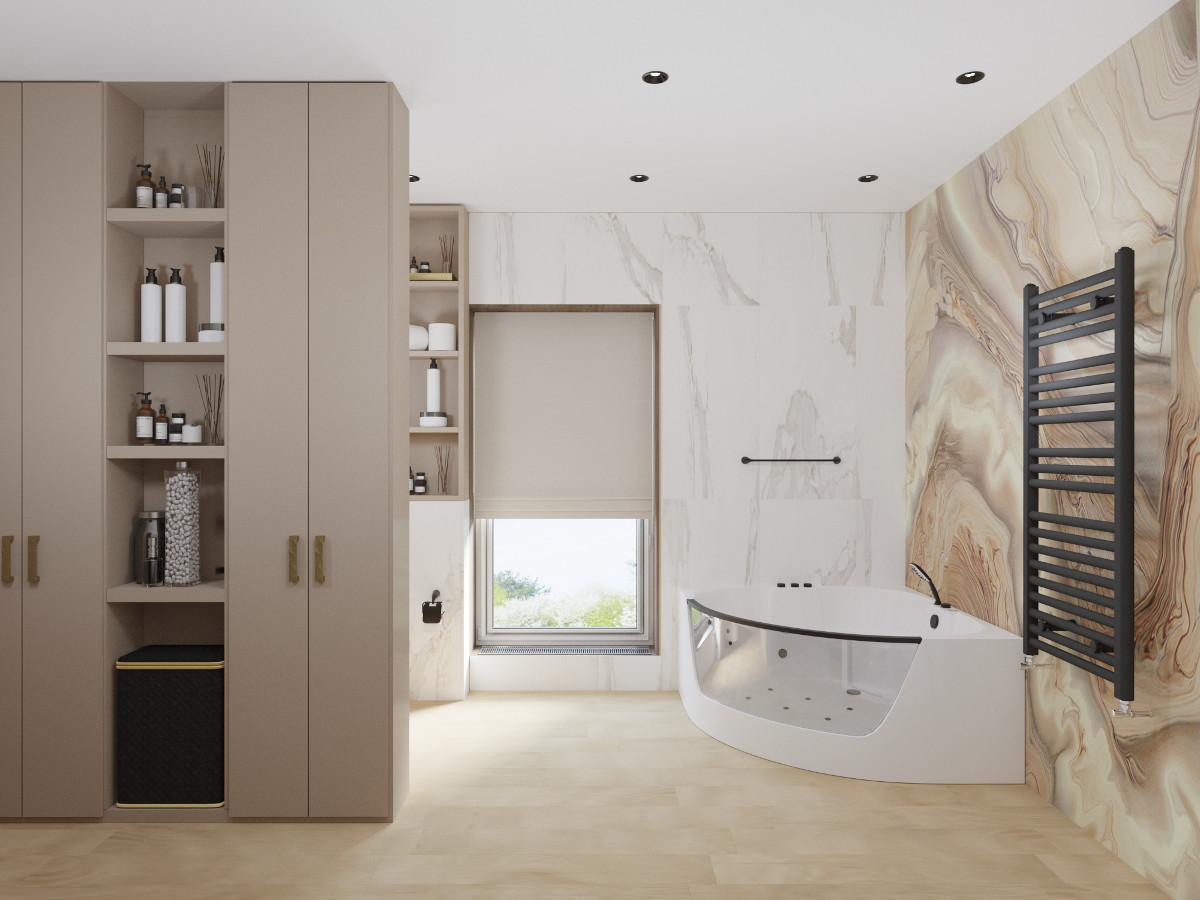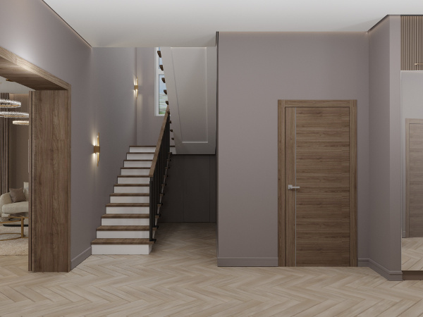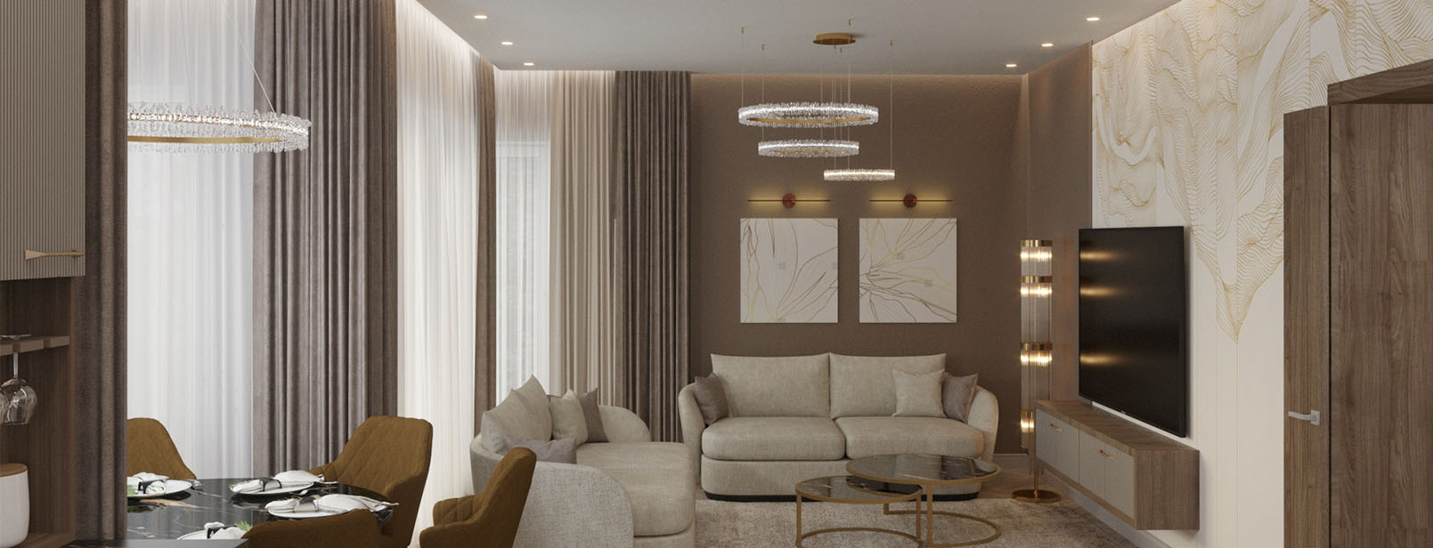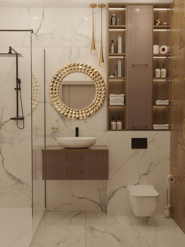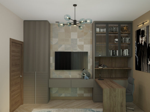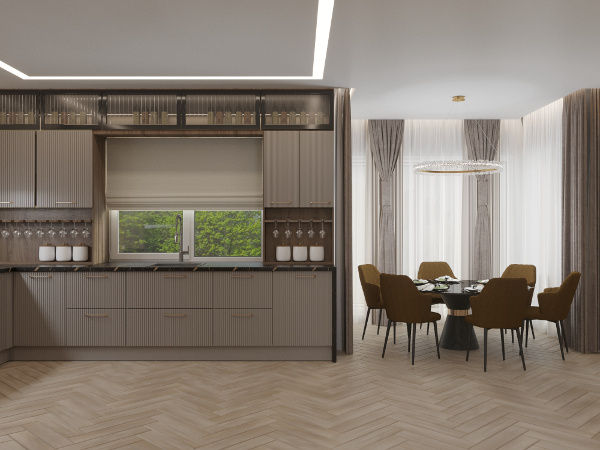 Настроение созданного интерьера повторяет атмосферу окружающей природы. Тёплые глубокие оттенки серого и кофейного, простые формы, геометрические линии сочетаются с фактурами дерева и благородного мрамора. Всё это разбавлено уютным текстилем и художественным декором.