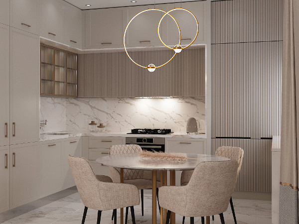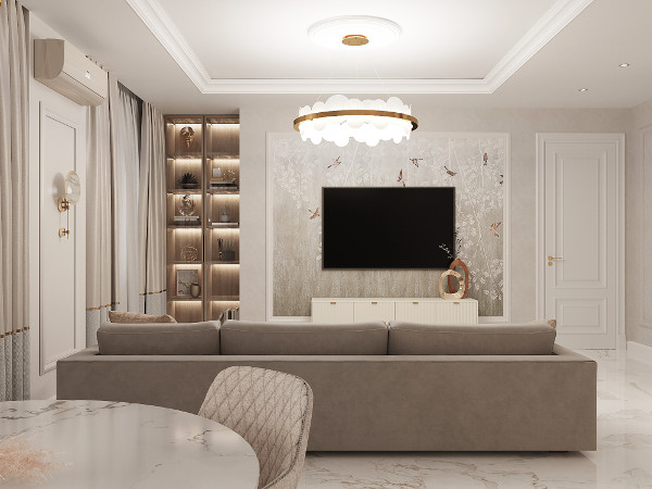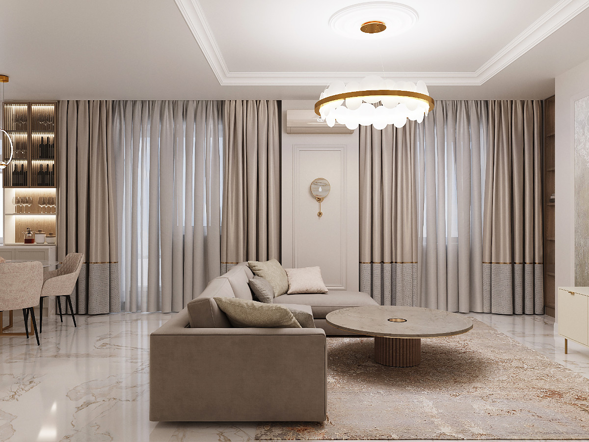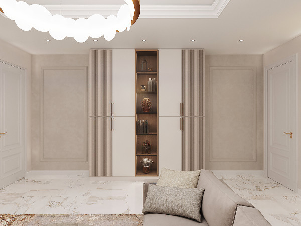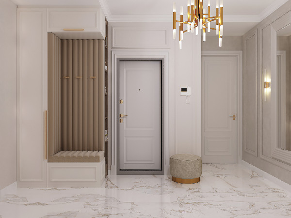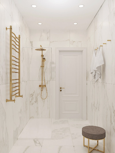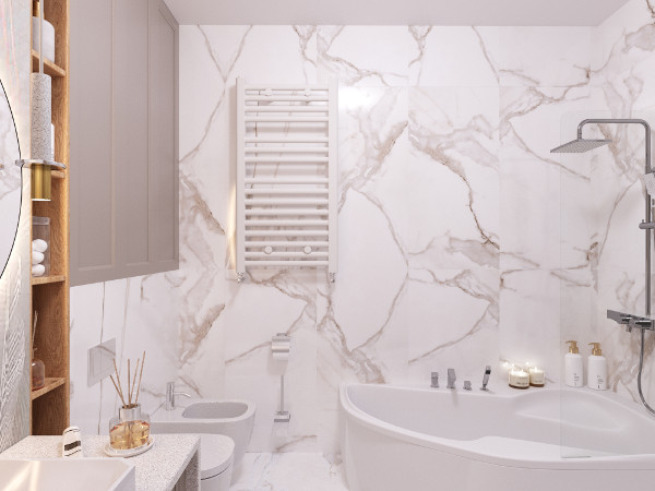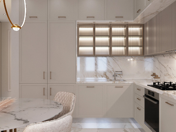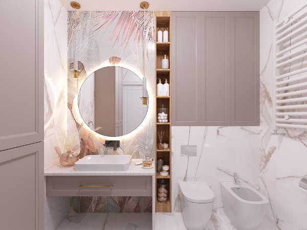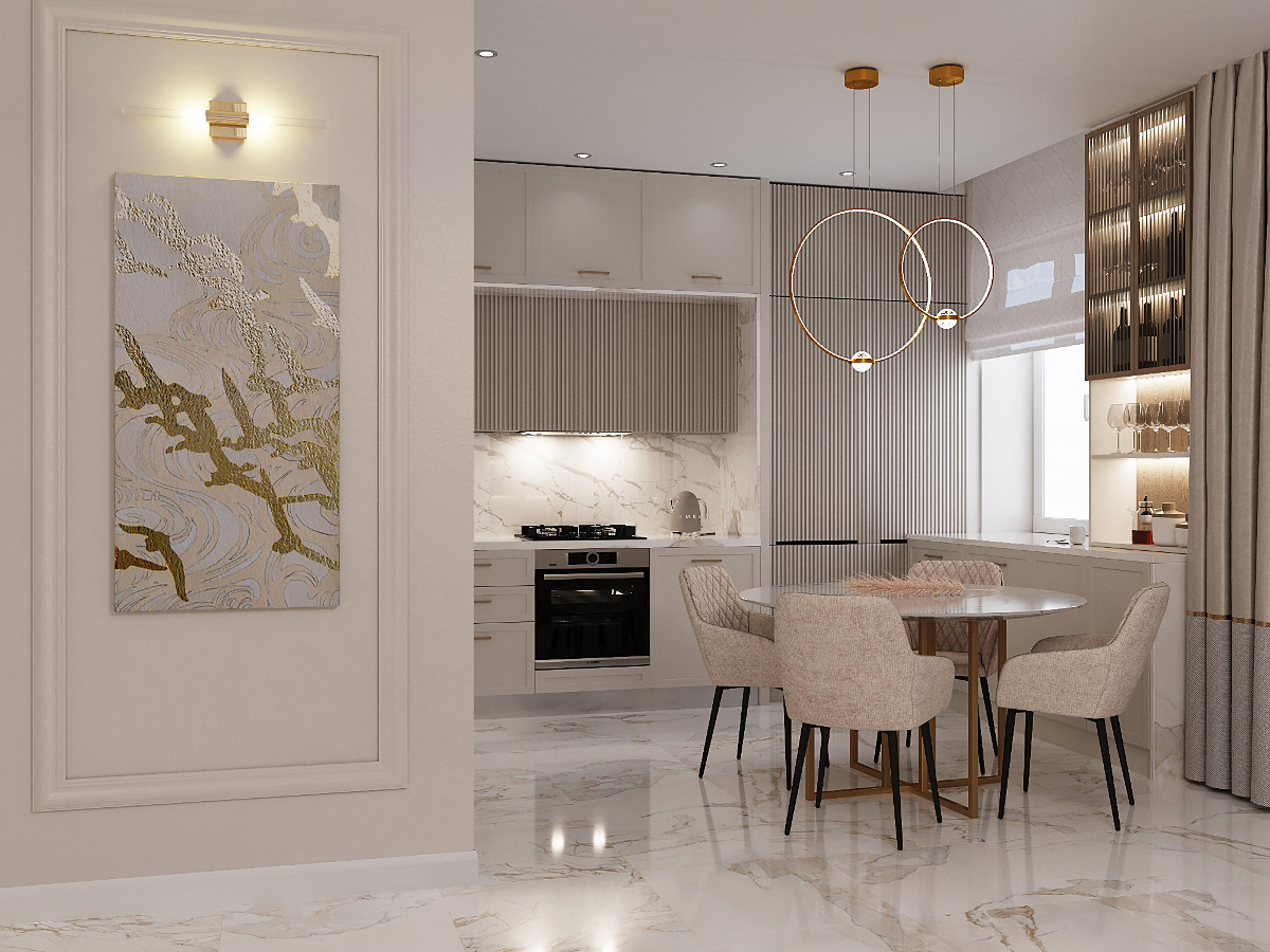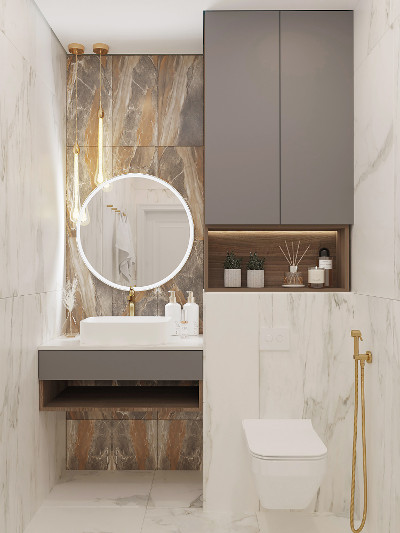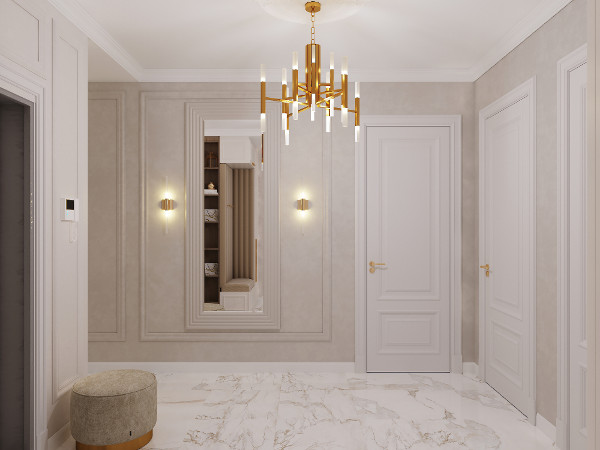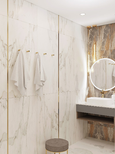 преимущественно пастельные тона. Кремово-песочный фон стен и шикарный мраморный