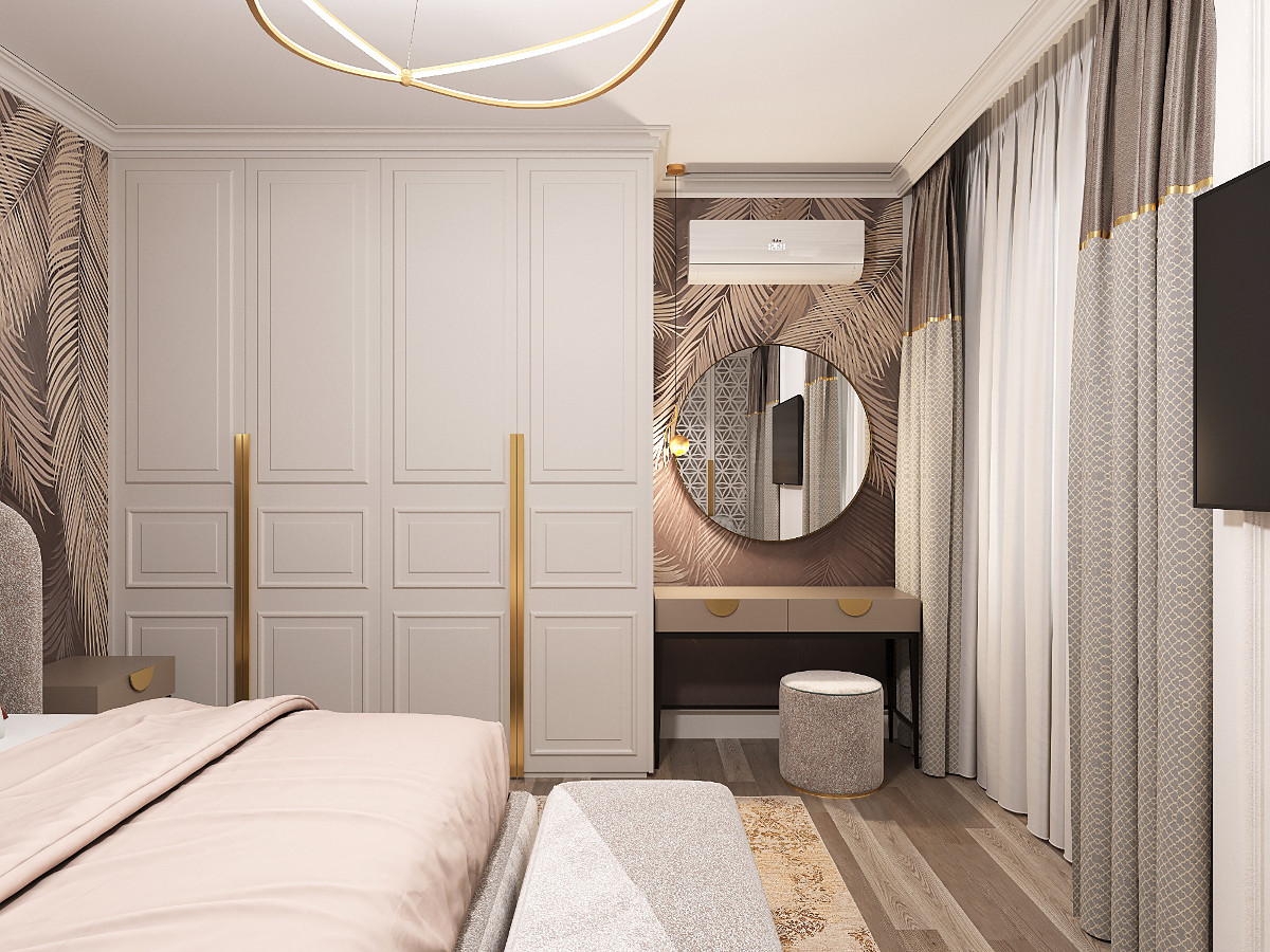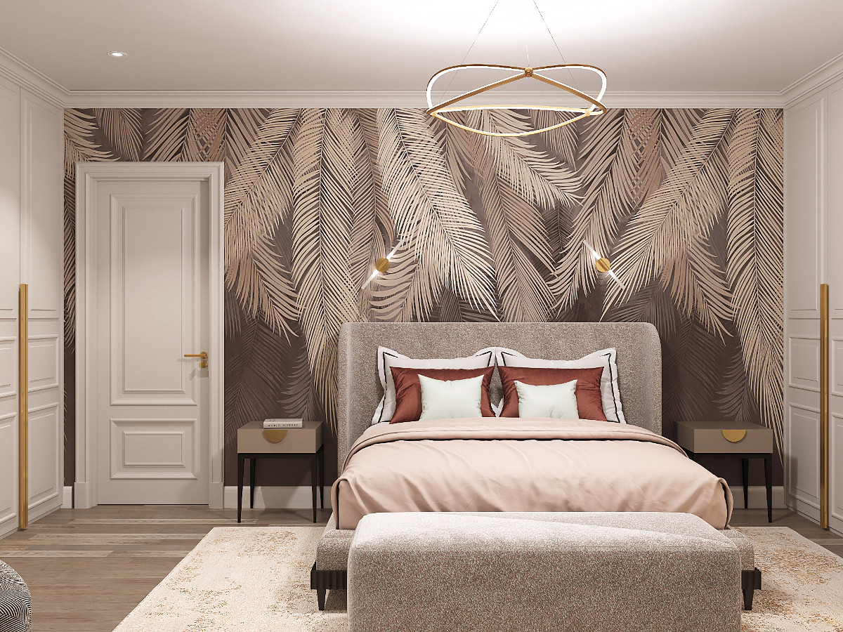 В спальне за хорошее настроение отвечает фреска с пальмовыми листьями на кофейном